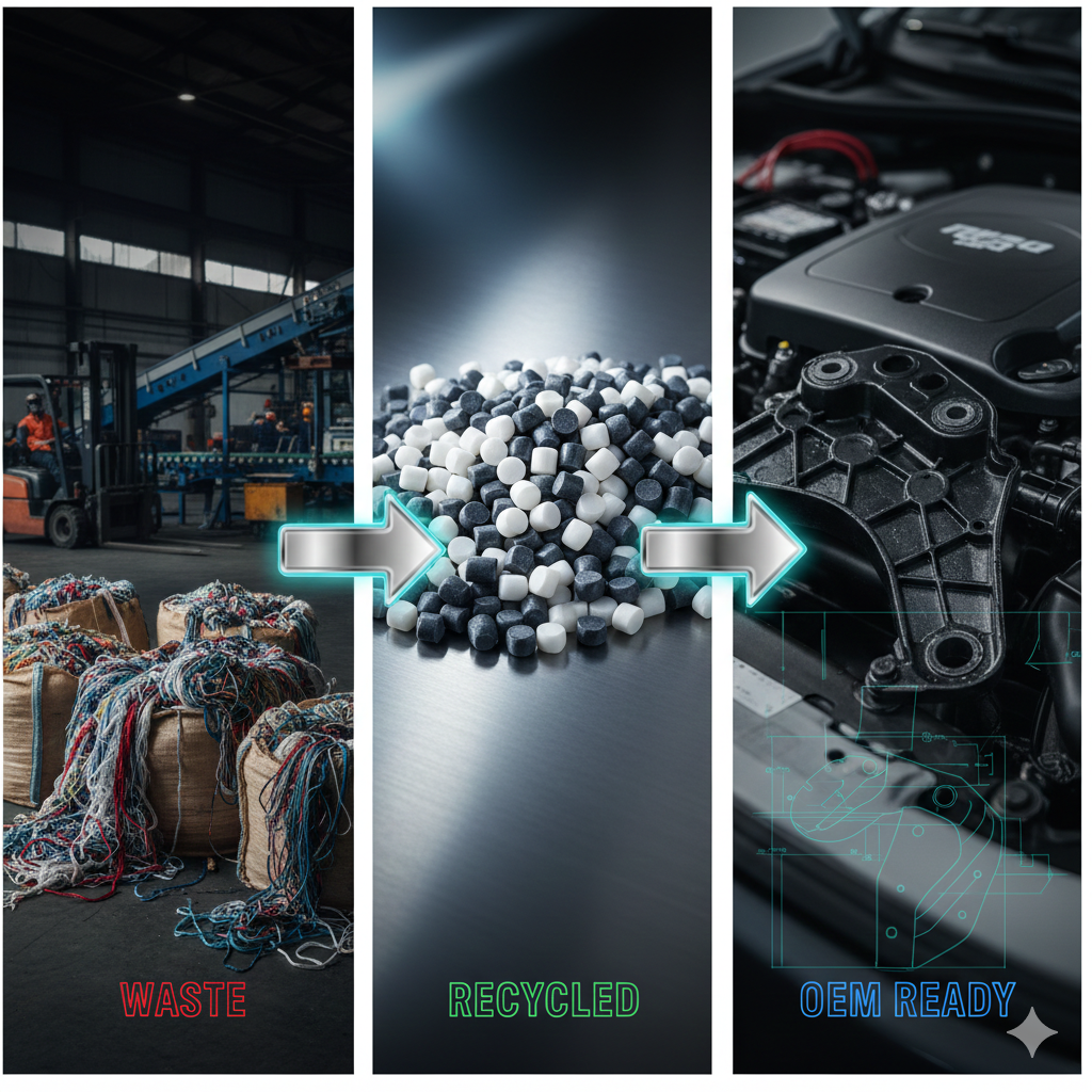 Transforming post-industrial yarn waste into world-class recycled Nylon & Polyester for automotive, textiles, and engineering.